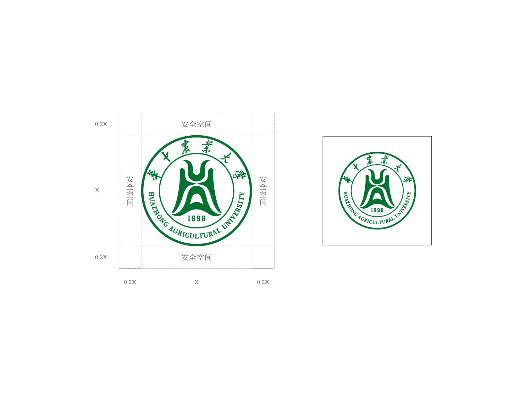 为了保证校徽在应用时的最佳视觉效果,避免收到其他元素的干扰和破坏,专门设定了校徽的安全空间。最小安全空间设定为0.2X(校徽的直径为X)。